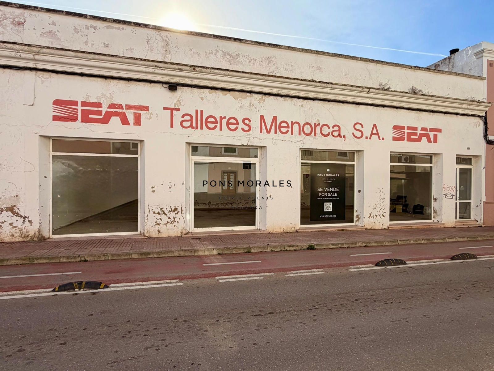 This impressive commercial property on Camí de Maó, a short distance from Ciutadella's center, features a spacious 527 sqm ground floor with ample counter space. Divided into two areas—a former repair shop and a retail space—it also holds the potential for vertical expansion, complying with current regulations for constructing a ground floor plus two additional levels.